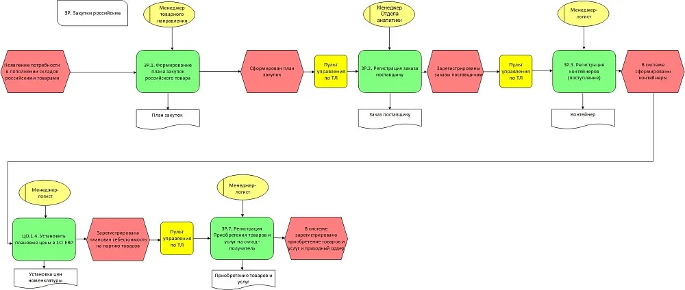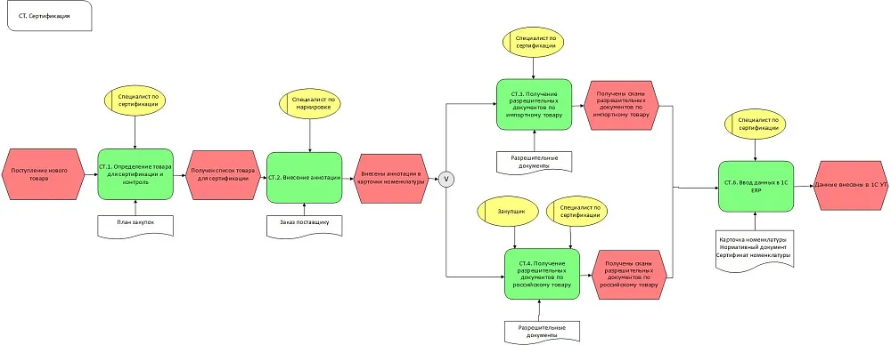 Для примера работы и передачи на поддержку рассмотрим два процесса из реального большого проекта. Один процесс относительно несложный — сертификация товаров. Другой процесс уже посложнее — это закупки российские (то есть не импорт и не закупка в ЕвраЭС).