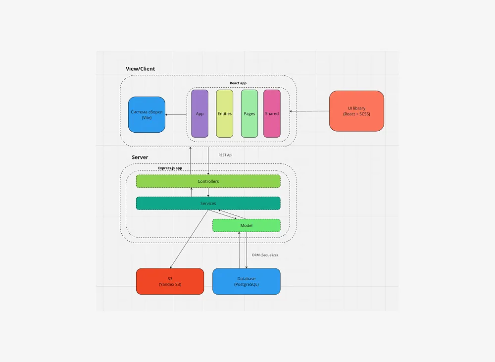 Backend: Тут я долго выбирал между Express.js и Nest.js. В Nest.js мне нравился ОПП подход, а Express.js тем, что можно быстро написать простенький сервер, и у меня уже был небольшой опыт работы с ним. В итоге решил остановиться на Express.js. Также было очевидно, что для хранения треков понадобится облако (с которым я ранее не работал). В результате небольшого поиска наткнулся на библиотеку easy-yandex-s3, которая дает возможность легкого взаимодействия с облаком. Для авторизации решил использовать подход sessions+cookie. Для работы с файлами использовал multer, мне понравилась простота документации и возможностью хранить файл в оперативной памяти перед отправкой на облако.