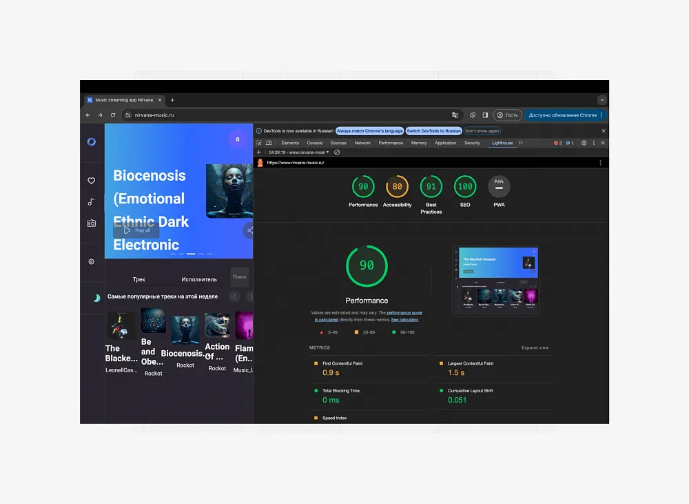 Также проект показывает достаточно хороший performance по метрикам Lighthouse